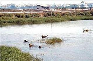 南市紅樹林協會總幹事李進添帶隊遊湖解說時,也常遇到野狗捕魚或集體渡河的有趣畫面,讓遊客大呼過癮,而野狗的狩獵秀也成了四草湖一大奇觀。