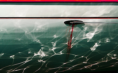 這幅圖很像我的心情,(放在桌面上),水與光合成的水紋,與滴落的血液,像揉合在我身上的超然與沉重,自然形成兩個極端。我有很典型的性格:因為我想看見危險,而跨越兩個世界的邊際。只是,很少人穿透表象,感受得出來。